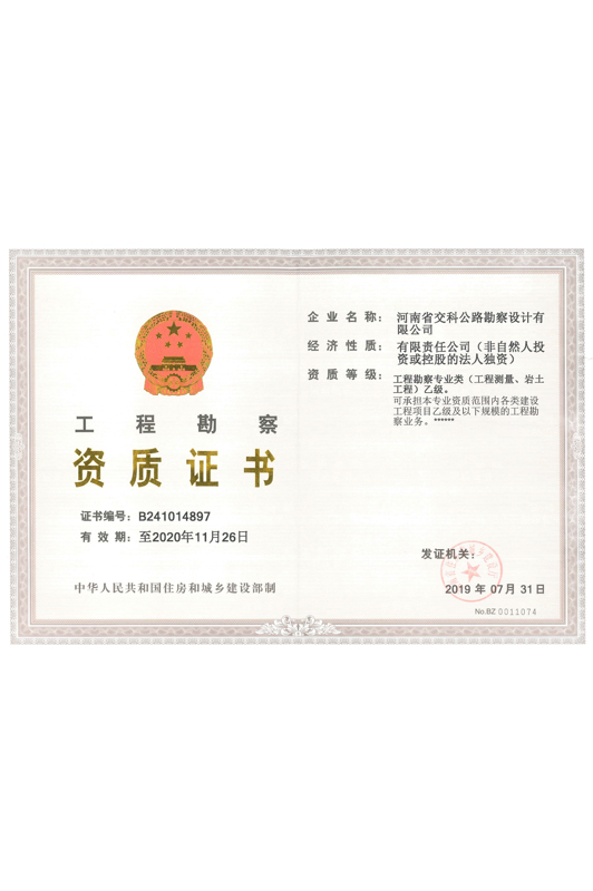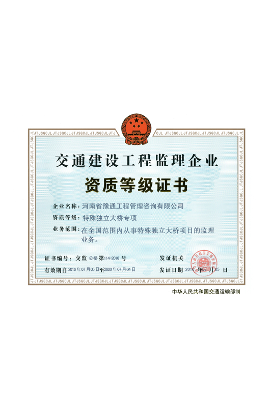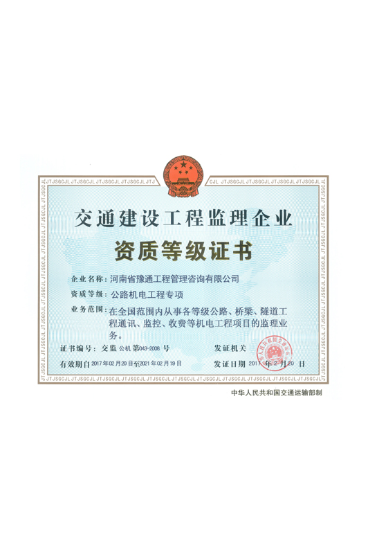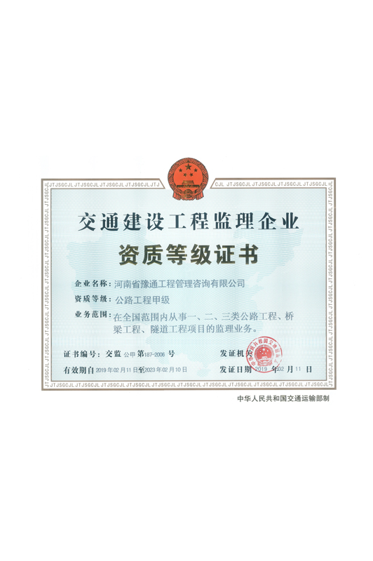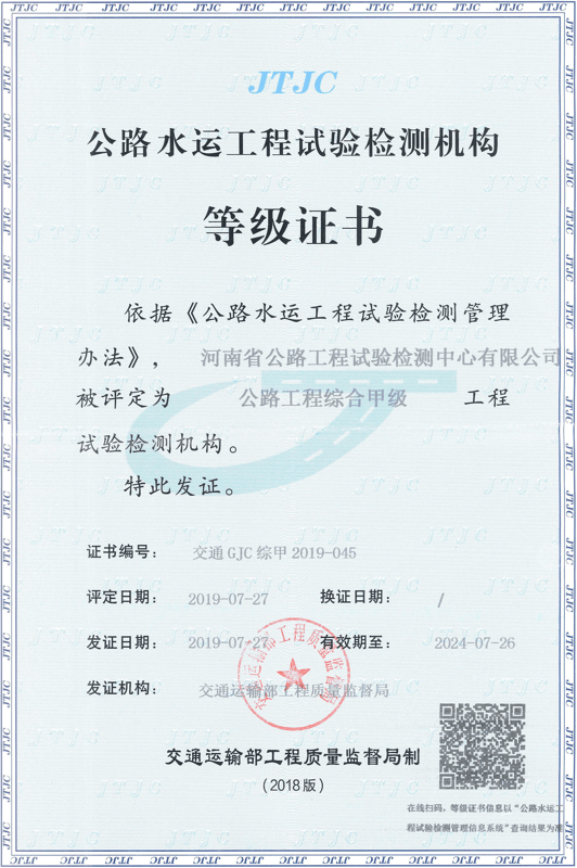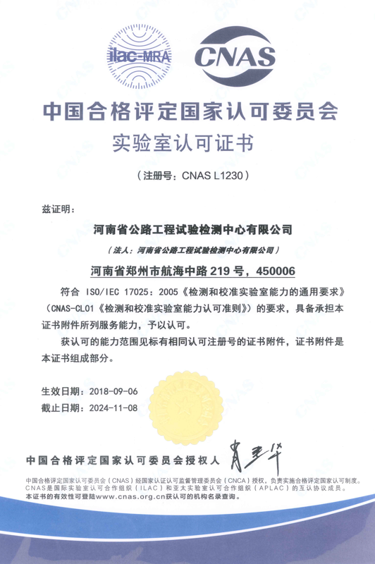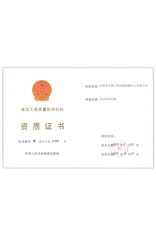 公司自成立以來,己先后通過實驗室計量資質認定、交通運輸部公路工程綜合甲級試驗資質以及國家實驗室認可。1996年5月通過河南省質量技術監督局計量認證初次評審;2000年5月通過交通運輸部公路工程甲級試驗資質審核;2004年3月通過國家實驗室認可初次評審;2007年8月通過交通運輸部公路工程綜合甲級試驗資質審核;2016年3月獲得河南省住建廳頒發的見證取樣資質。